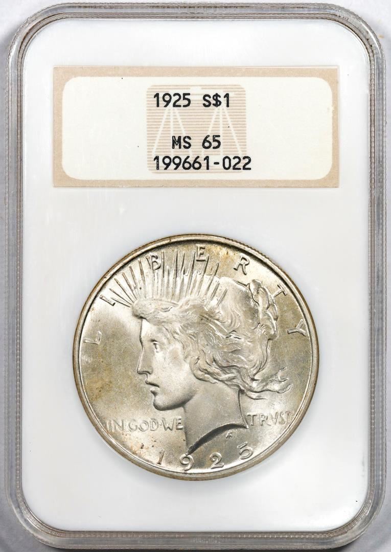 One 1925 $1 Peace Silver Dollar Coin NGC MS65 Old Fatty Holder. NGC Certified.