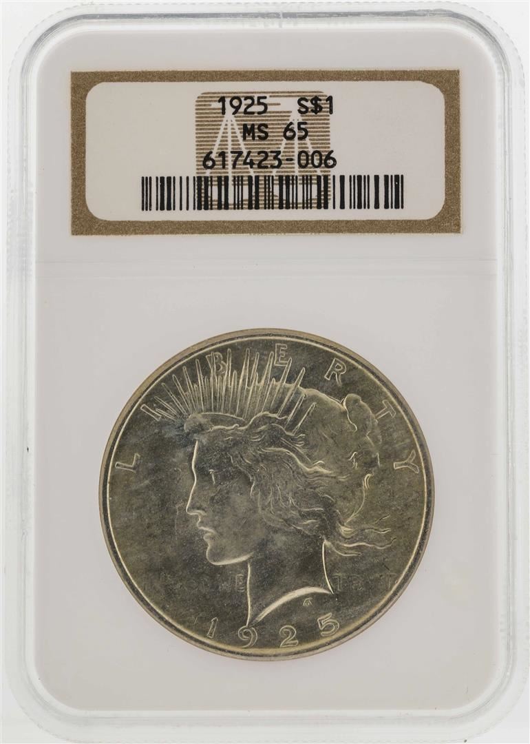 One 1925 $1 Peace Silver Dollar Coin NGC MS65. NGC Certified.