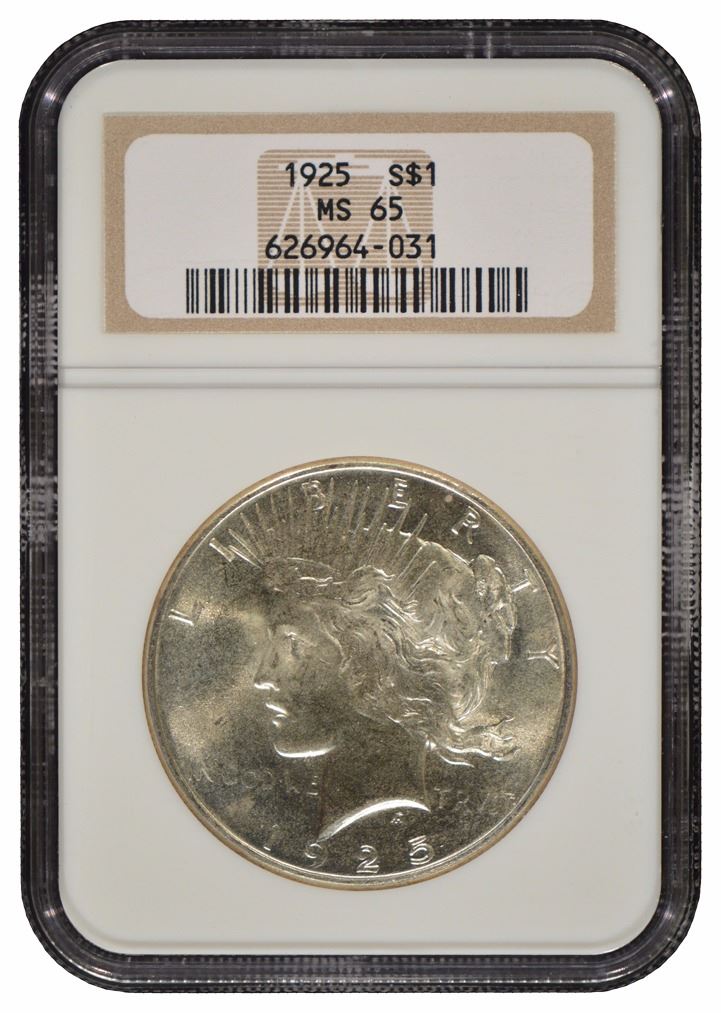 One 1925 $1 Peace Silver Dollar Coin NGC MS65.