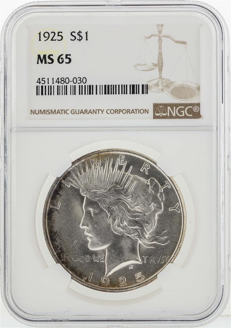 One 1925 $1 Peace Silver Dollar Coin NGC MS65. NGC Certified.
