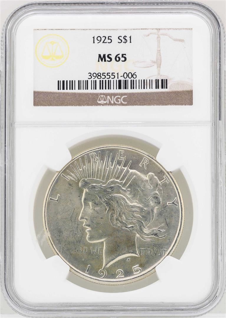 One 1925 $1 Peace Silver Dollar Coin NGC MS65. NGC Certified.