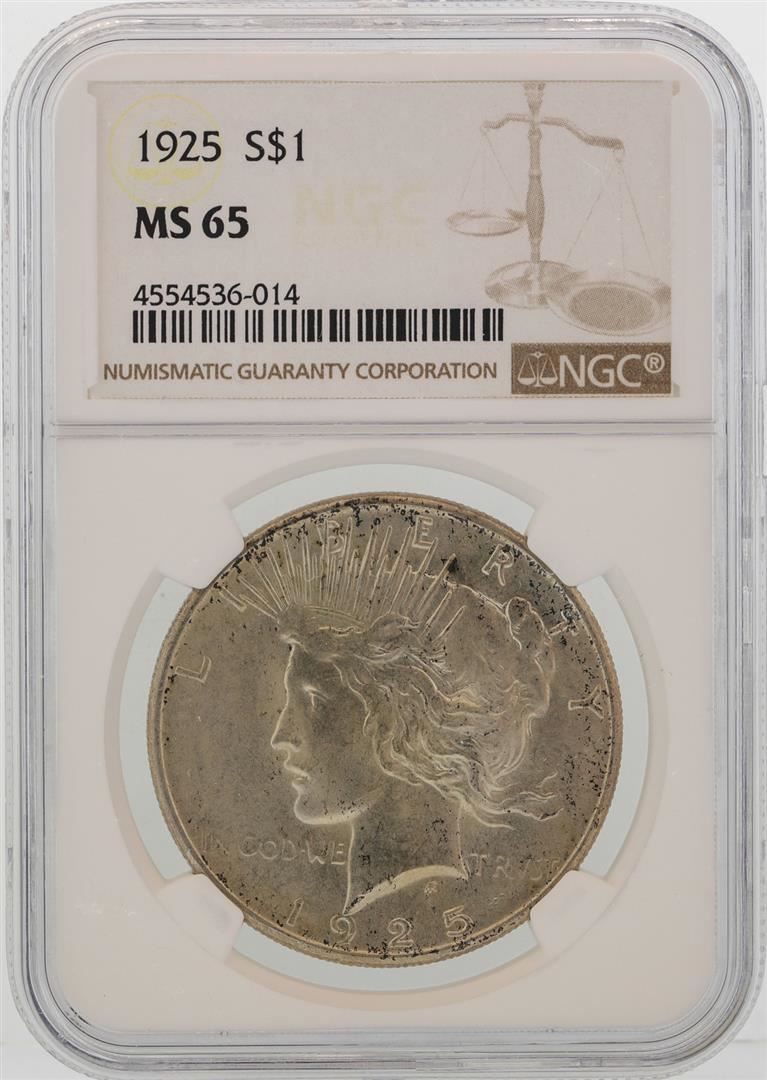 One 1925 $1 Peace Silver Dollar Coin NGC MS65. NGC Certified.