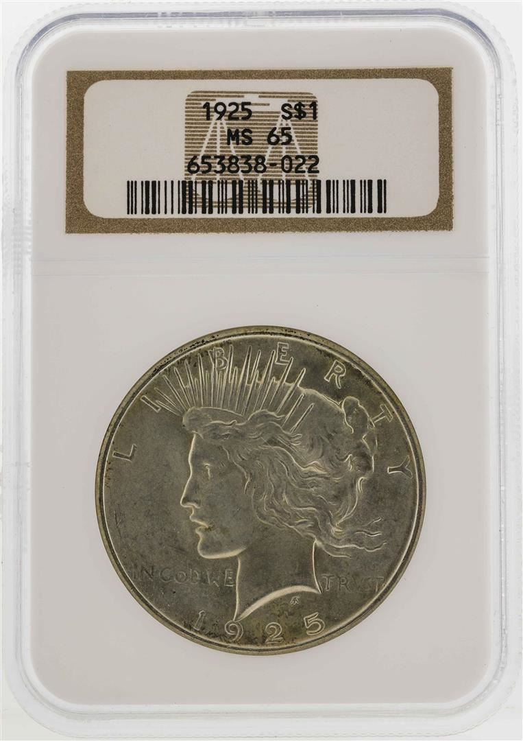 One 1925 $1 Peace Silver Dollar Coin NGC MS65. NGC Certified.