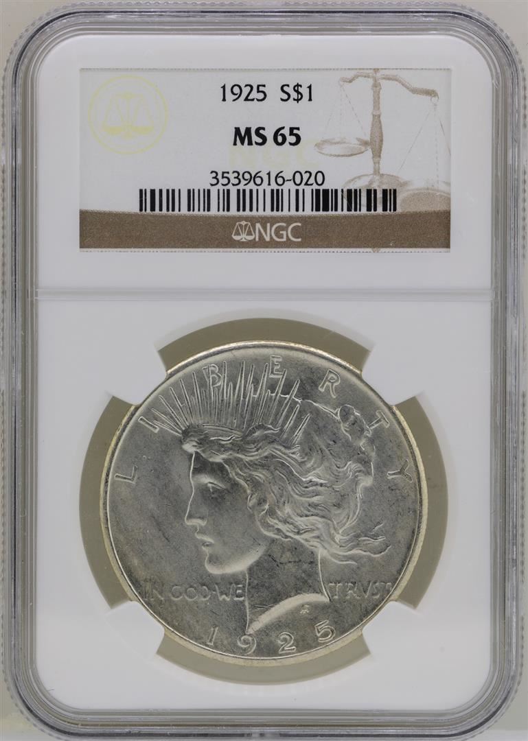 One 1925 $1 Peace Silver Dollar Coin NGC MS65. NGC Certified.