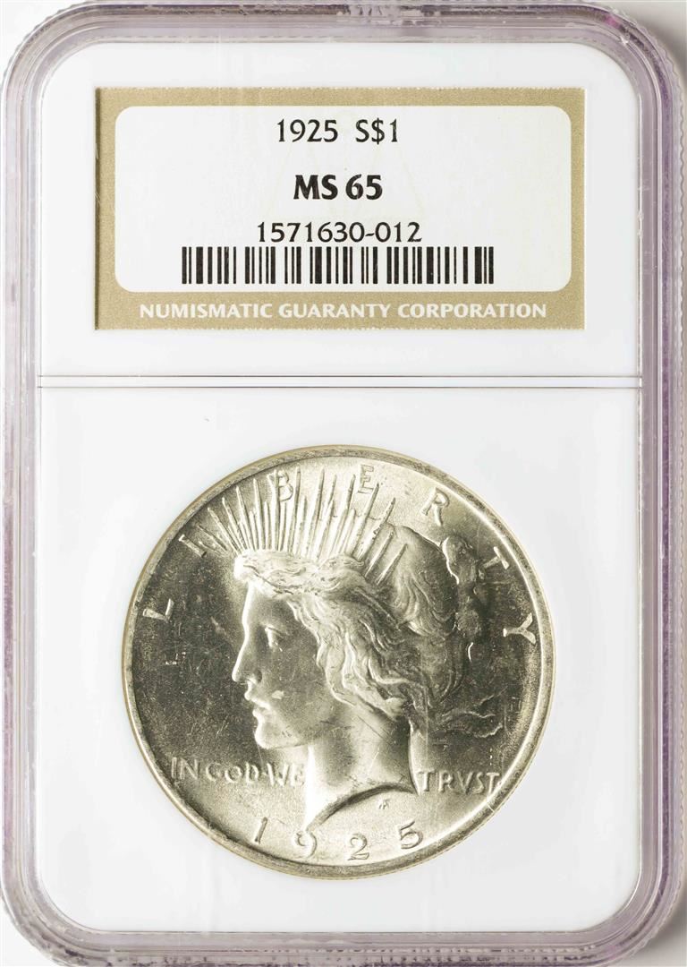 One 1925 $1 Peace Silver Dollar Coin NGC MS65. NGC Certified.