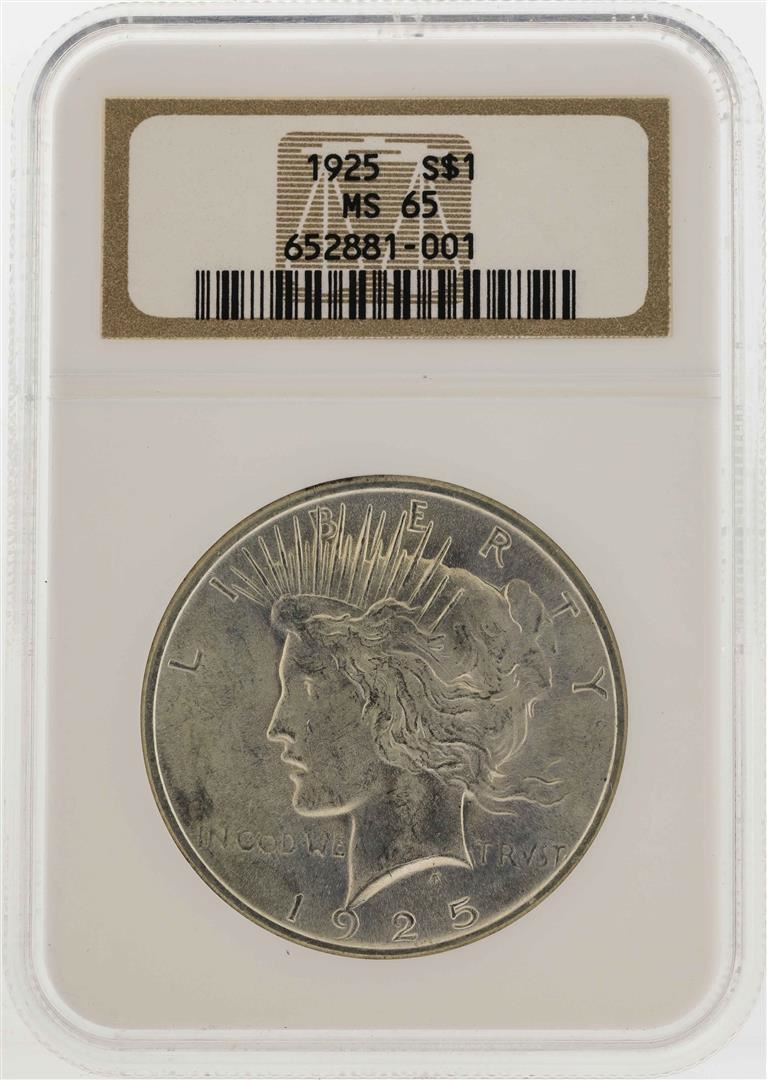 One 1925 $1 Peace Silver Dollar Coin NGC MS65. NGC Certified.