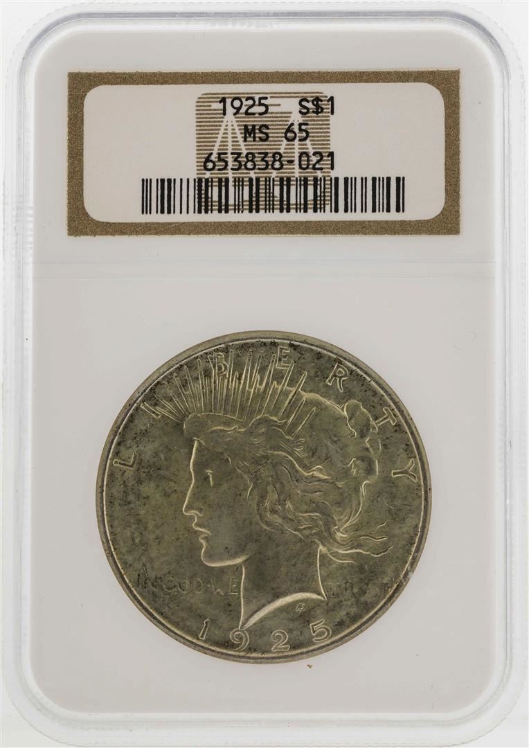 One 1925 $1 Peace Silver Dollar Coin NGC MS65. NGC Certified.