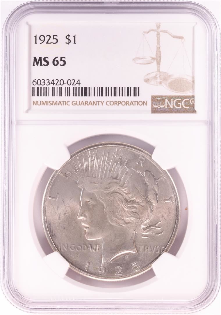 One 1925 $1 Peace Silver Dollar Coin NGC MS65. NGC Certified.