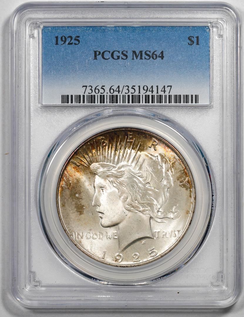 One 1925 $1 Peace Silver Dollar Coin PCGS MS64 Rare Toning. PCGS Graded.