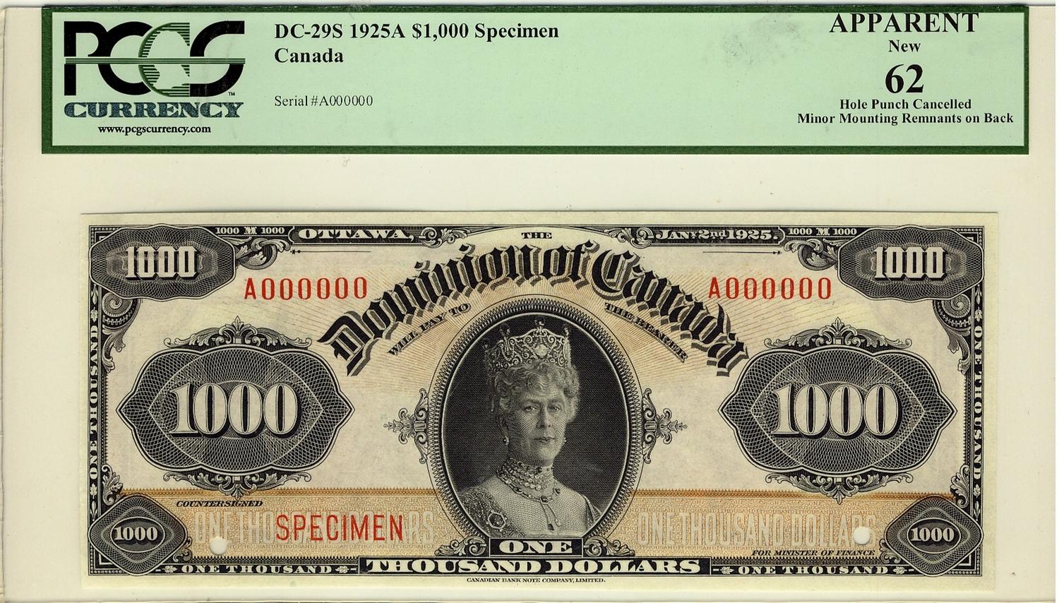 1925 $1000 DC-29s #A000000Specimen, PCGS UNC62. A superb example of this very sought after issue. Excessively rare and desirable. Despite all catalogues and expect strong bidding on this item. Minor mounting remnants on back.