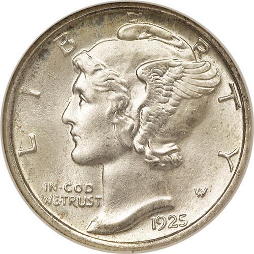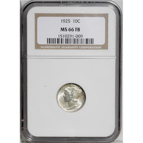 <B>1925<10C> MS66 Full Bands NGC.</B></I> A needle-sharp Premium Gem with a thin coating of pastel-golden patina over smooth surfaces. Lustrous and attractively preserved, the portrait is nearly immaculate as is the reverse field. More than 25 million pieces were struck and circulated examples are common, yet the 1925 is scarce in Mint State. Perfect for a competitive Registry Set. Census: 13 in 66, 2 finer (7/06).