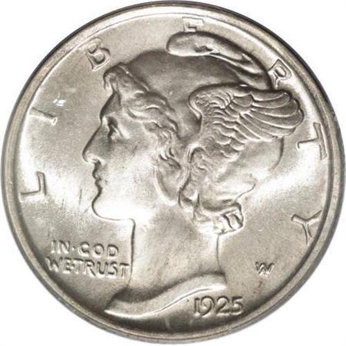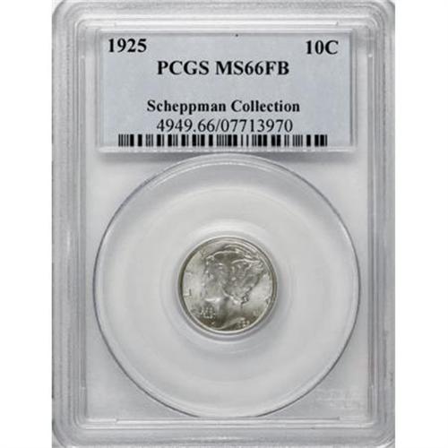 <B>1925 10C MS66 Full Bands PCGS.</B></I> Ex: William Dominick Collection. Satiny with delicate silver-blue tints that visit otherwise untoned surfaces. The overall detail is crisp, and the bands on the reverse show full separation. While this Philadelphia issue is considered common across most grades, the collector who has sought a Full Bands representative knows well how elusive pleasing examples can be. Population: 26 in 66 Full Bands, 3 finer (12/07).<BR><I>From The Scheppman Collection, #4 PCGS Registry of Full Band Mercury Dimes.</B></I><BR><BR><B>Coin Engraver:</B> Adolph A. Weinman<BR><BR><b>Shipping:</b> Coins & Currency (<a target="_blank" href="http://www.heritageauctions.com/common/shipping.php">view shipping information</a>)