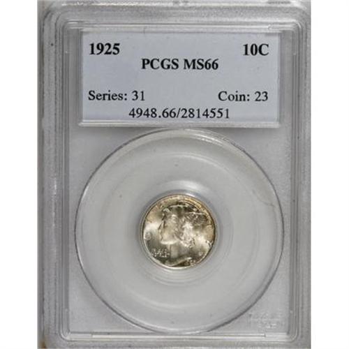 <B>1925 10C MS66 PCGS.</B></I> PCGS Population (6/0). NGC Census: (8/1). Mintage: 25,610,000. Numismedia Wsl. Price for NGC/PCGS coin in MS66: $420. (#4948)<BR><BR><B>Coin Engraver:</B> Adolph A. Weinman<BR><BR><b>Shipping:</b> Coins & Currency (<a target="_blank" href="http://www.heritageauctions.com/common/shipping.php">view shipping information</a>)