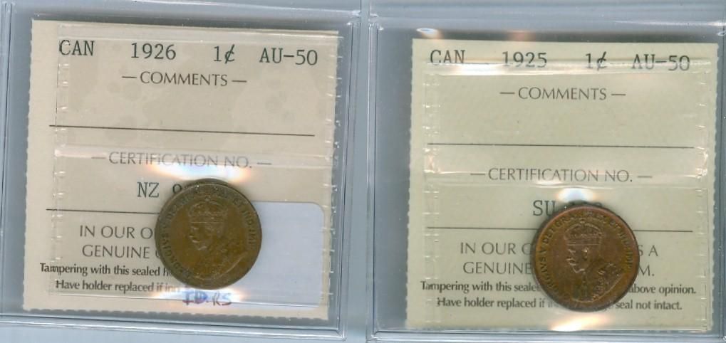 1925 & 1926 1¢ ICCS AU50. Lot of 2 key dates.