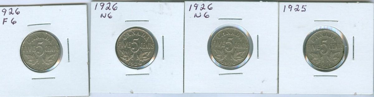 1925 & 1926 5¢. Lot of four coins including, 1925 F15, 1926