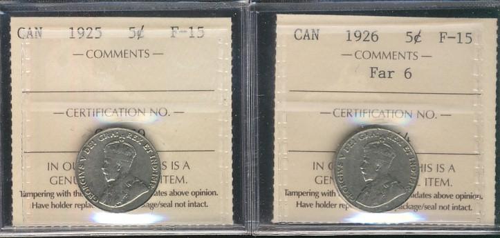 1925 & 1926 Far 5¢ ICCS F15. Lot of 2 coins.