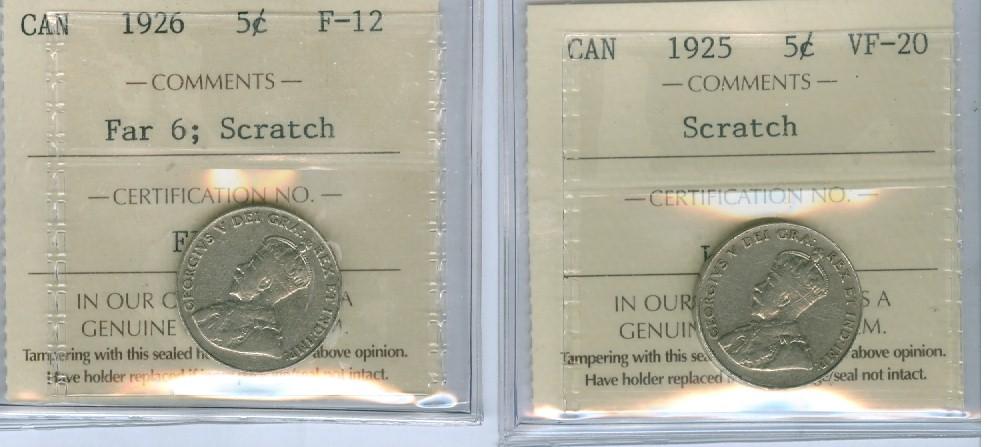 1925 & 1926 Far 5¢. Lot of two coins ICCS VF20 (Scratch) and F12 (Scratch respectively).