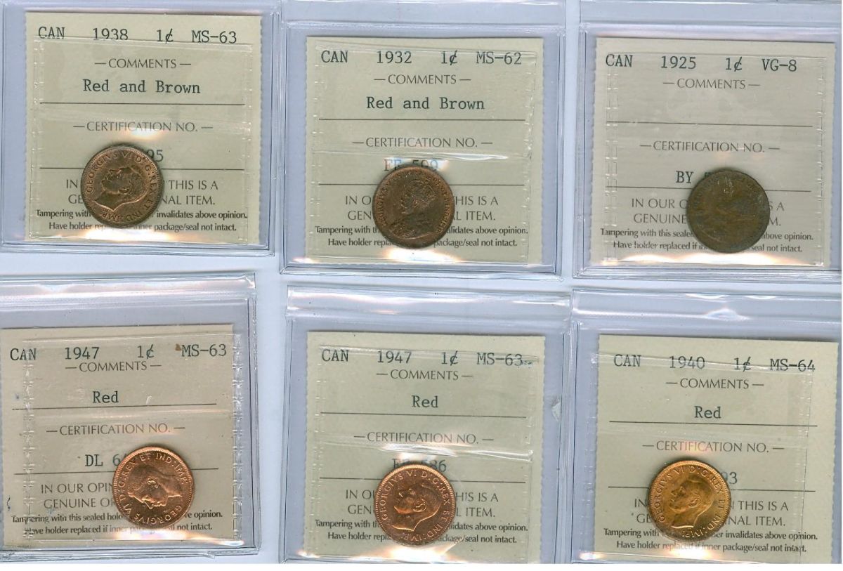 1925-1947 1¢. Lot of 6 ICCS graded coins including 1925 VG8, 1932 MS62RB, 1938, MS63RB, 1940 MS64RD, 1947(2) MS63R and 1947RD.