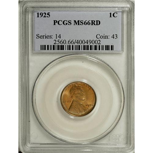 <B>1925 1C MS66 Red PCGS.</B></I> PCGS Population (277/49). NGC Census: (182/52). Mintage: 139,948,992. Numismedia Wsl. Price for NGC/PCGS coin in MS66: $300. (#2560)<BR><BR><b>Shipping:</b> Coins & Currency (<a target="_blank" href="http://www.heritageauctions.com/common/shipping.php">view shipping information</a>)