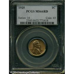 1925 1C MS66 Red PCGS. Pleasing coppery-gold patin <B>1925 1C MS66 Red PCGS.</B></I> Pleasing coppery-gold patination over lustrous surfaces, along with well struck devices. There are no noticeable contact marks or unsightly spots. <BR><BR><B>Important notice:</B> Heritage usually auctions material at the rate of 200-250 lots per hour. On some occasions eBay Live bid software or the Internet may not be able to keep up with the pace of the auction. We recommend placing a realistic absentee bid now as insurance to avoid disappointment. Occasionally the auctioneer may eliminate or reject an eBay Live bid, and the auctioneer may also reopen a lot after the close of the eBay live bidding (usually because we missed an audience bid), and may reject your bid even if it shows you as the winning bidder. By bidding via eBay Live, you agree that Heritage may award the lot to another bidder at its sole discretion under the circumstances described above or any other reasonable circumstances. Since eBay bids are not shown to us until we open the lot on the floor, we treat those bids just like floor bids. In most cases the floor responds before the eBay bid is presented to us, due to Internet lag time, so for consistency we have made it a policy that floor bids are always considered first over tie eBay live bids. Also please note that all Heritage lots purchased through eBay Live carry a 20% Buyer's Premium. Please make sure you read the Terms and Conditions before you bid. This lot is being auctioned in conjunction with a live floor auction by Heritage Galleries & Auctioneers. All final auction and invoice information will be supplied by Heritage Galleries & Auctioneers, and all other information should be considered preliminary. Lot:5297