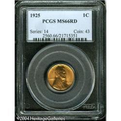 1925 1C MS66 Red PCGS. Well struck and fully lustr <B>1925 1C MS66 Red PCGS.</B></I> Well struck and fully lustrous, with bright mint-red color and essentially unmarked surfaces on both obverse and reverse. A great little premium quality Gem, which may even be undergraded at this level. <BR><BR><B>Important notice:</B> Heritage usually auctions material at the rate of 200-250 lots per hour. On some occasions eBay Live bid software or the Internet may not be able to keep up with the pace of the auction. We recommend placing a realistic absentee bid now as insurance to avoid disappointment. Occasionally the auctioneer may eliminate or reject an eBay Live bid, and the auctioneer may also reopen a lot after the close of the eBay live bidding (usually because we missed an audience bid), and may reject your bid even if it shows you as the winning bidder. By bidding via eBay Live, you agree that Heritage may award the lot to another bidder at its sole discretion under the circumstances described above or any other reasonable circumstances. Since eBay bids are not shown to us until we open the lot on the floor, we treat those bids just like floor bids. In most cases the floor responds before the eBay bid is presented to us, due to Internet lag time, so for consistency we have made it a policy that floor bids are always considered first over tie eBay live bids. Also please note that all Heritage lots purchased through eBay Live carry a 20% Buyer's Premium. Please make sure you read the Terms and Conditions before you bid. This lot is being auctioned in conjunction with a live floor auction by Heritage Galleries & Auctioneers. All final auction and invoice information will be supplied by Heritage Galleries & Auctioneers, and all other information should be considered preliminary. Lot:5298