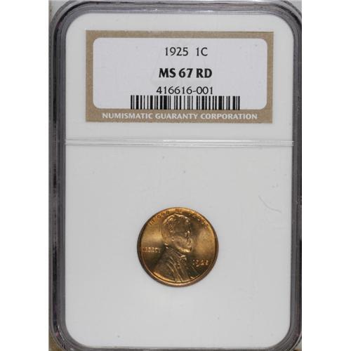 <B>1925 1C MS67 Red NGC.</B></I> Attractive copper-gold patina embraces fully lustrous surfaces. The design elements are adequately struck, and a couple of minuscule obverse flecks are mentioned for accuracy. Census: 26 in 67 Red, 0 finer (4/07).<BR><BR><b>Shipping:</b> Coins & Currency (<a target="_blank" href="http://www.heritageauctions.com/common/shipping.php">view shipping information</a>)