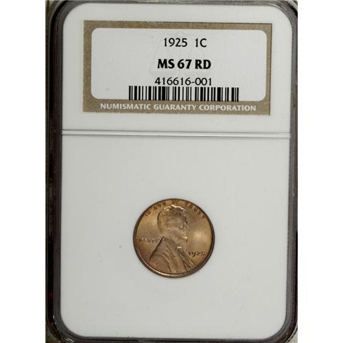 <B>1925 1C MS67 Red NGC.</B></I> Very attractive coppery-gold patina embraces fully lustrous surfaces. The design elements are adequately struck, and a couple of miniscule obverse flecks are mentioned for accuracy. Census: 26 in 67, 0 finer (12/06).<BR><BR><b>Shipping:</b> Coin/Currency (<a target="_blank" href="http://www.heritageauctions.com/common/shipping.php">view shipping information</a>)