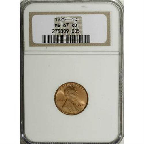 <B>1925 1C MS67 Red NGC.</B></I> A beautiful peach-red Superb Gem that boasts a sharp strike and a minimum of pinpoint carbon flecks. Neither NGC nor PCGS has certified any examples in higher grades.<BR><BR><B>Coin Engraver:</B> Victor D. Brenner<BR><BR><b>Shipping:</b> Coins & Currency (<a target="_blank" href="http://www.heritageauctions.com/common/shipping.php">view shipping information</a>)