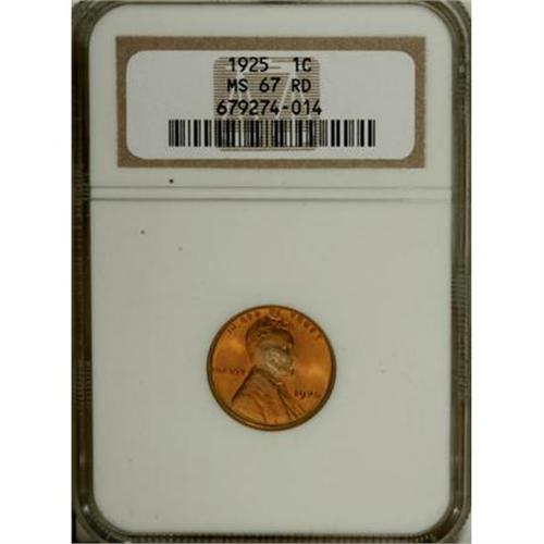 <B>1925 1C MS67 Red NGC.</B></I> Sun-gold luster sweeps this essentially pristine Superb Gem. Lincoln's jaw is lemon-gold. Boldly struck and beautiful. Census: 26 in 67 Red, 0 finer (1/08).<BR><BR><B>Coin Engraver:</B> Victor D. Brenner<BR><BR><b>Shipping:</b> Coins & Currency (<a target="_blank" href="http://www.heritageauctions.com/common/shipping.php">view shipping information</a>)