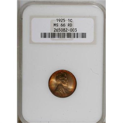 <B>1925 1C MS66 Red NGC.</B></I> NGC Census: (91/26). PCGS Population (276/49). Mintage: 139,948,992. Numismedia Wsl. Price for NGC/PCGS coin in MS66: $300. (#2560)<BR><BR><B>Coin Engraver:</B> Victor D. Brenner<BR><BR><b>Shipping:</b> Coins & Currency (<a target="_blank" href="http://www.heritageauctions.com/common/shipping.php">view shipping information</a>)