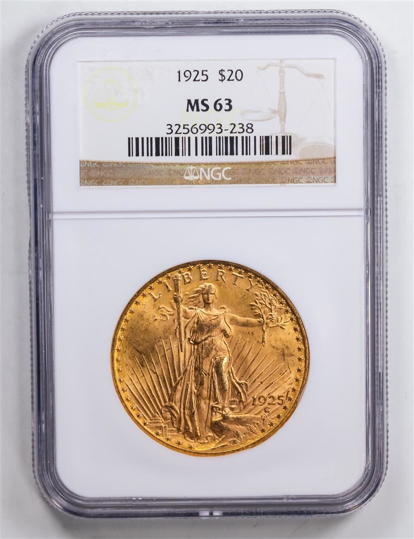 One 1925 $20 Double Eagle Gold Coin NGC MS63.
