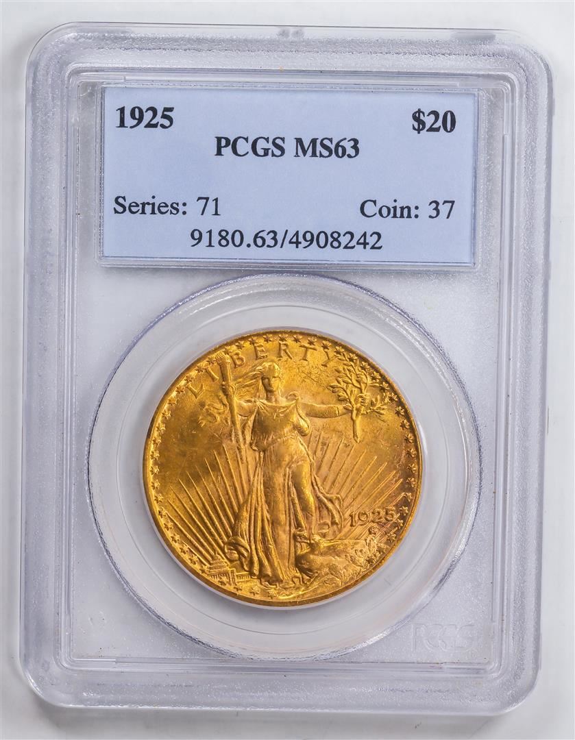 One 1925 $20 Double Eagle Gold Coin PCGS MS63.