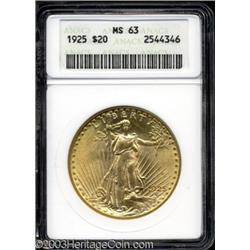 <table><tr><td><TABLE cellSpacing=0 cellPadding=0 width="100%" bgColor=#000000 border=0><TBODY> <TR><TD width="100%"><TABLE cellSpacing=1 cellPadding=3 width="100%" border=0><TBODY><TR><TD width="100%" bgColor=#79735c><FONT face=arial color=#ffffff size=3><B>Description</B> </FONT></TD></TR><TR><TD width="100%" bgColor=#ffffff><FONT face=arial size=2><B>1925 $20 MS63 ANACS.</B></I> Imposing luster and pleasing surfaces are the hallmarks of this crisply struck common date Twenty. The sun has a small planchet flaw, as made.<BR><I>Ex: Stack's, 6/1994, lot 792, where it realized $462.</B></I> </FONT></TD></TR></TBODY></TABLE></TD></TR></TBODY></TABLE><BR><A name=PricesRealized></A><TABLE cellSpacing=0 cellPadding=0 width="100%" bgColor=#000000 border=0><TBODY><TR><TD width="100%"><TABLE cellSpacing=1 cellPadding=3 width="100%" border=0><TBODY><TR><TD width="100%" bgColor=#79735c><A name=PR><FONT face=arial color=#ffffff size=3><B>Previous Prices from Heritage Auctions</B> </FONT></A></TD></TR><TR><TD bgColor=#f6f6ed><TABLE cellSpacing=0 cellPadding=0 width="100%" border=1><TBODY><TR><TD align=middle width="33%"><B>Date</B></TD><TD align=middle width="33%"><B>Service</B></TD><TD align=middle width="33%"><B>Price</B></TD></TR><TR bgColor=whitesmoke><TD width="33%"><B>08/06/2003</B></TD><TD width="33%">PCGS</TD><TD width="33%">$471.50</TD></TR><TR bgColor=whitesmoke><TD width="33%"><B>01/11/2003</B></TD><TD width="33%">NGC</TD><TD width="33%">$448.50</TD></TR><TR bgColor=whitesmoke><TD width="33%"><B>09/28/2002</B></TD><TD width="33%">NGC</TD><TD width="33%">$431.25</TD></TR><TR bgColor=whitesmoke><TD width="33%"><B>06/10/2002</B></TD><TD width="33%">PCGS</TD><TD width="33%">$414.00</TD></TR><TR bgColor=whitesmoke><TD width="33%"><B>06/08/2002</B></TD><TD width="33%">PCGS</TD><TD width="33%">$414.00</TD></TR><TR bgColor=whitesmoke><TD width="33%"><B>04/28/2002</B></TD><TD width="33%">PCGS</TD><TD width="33%">$379.50</TD></TR><TR bgColor=whitesmoke><TD width="33%"><B>04/05/2001</B></TD><TD width="33%">PCGS</TD><TD width="33%">$356.50</TD></TR><TR bgColor=whitesmoke><TD width="33%"><B>10/06/2000</B></TD><TD width="33%">NGC</TD><TD width="33%">$379.50</TD></TR><TR bgColor=whitesmoke><TD width="33%"><B>01/07/2000</B></TD><TD width="33%">PCGS</TD><TD width="33%">$431.25</TD></TR><TR bgColor=whitesmoke><TD width="33%"><B>11/07/1998</B></TD><TD width="33%">NGC</TD><TD width="33%">$550.00</TD></TR><TR bgColor=whitesmoke><TD width="33%"><B>05/02/1997</B></TD><TD width="33%">PCGS</TD><TD width="33%">$467.50</TD></TR><TR bgColor=whitesmoke><TD width="33%"><B>06/04/1995</B></TD><TD width="33%">NGC</TD><TD width="33%">$627.00</TD></TR><TR bgColor=whitesmoke><TD width="33%"><B>10/08/1994</B></TD><TD width="33%">PCGS</TD><TD width="33%">$528.00</TD></TR><TR bgColor=whitesmoke><TD width="33%"><B>04/08/1994</B></TD><TD width="33%">PCGS</TD><TD width="33%">$506.00</TD></TR><TR bgColor=whitesmoke><TD width="33%"><B>01/06/1993</B></TD><TD width="33%">NGC</TD><TD width="33%">$577.50</TD></TR></TBODY></TABLE></TD></TR><TR><TD bgColor=#ffffff><FONT face=arial size=1 ?>PLEASE NOTE: All prices realized reflect the final hammer price PLUS the buyer's premium in auctions that charge a buyer's premium. Each item has a notation at the top of the listing indicating whether that lot included a buyer's premium. Example: A item that sells with a final hammer price of $100 and a 20% buyer's premium will display with a price realized of $120. All information listed is intended to be as accurate as possible, but errors are possible. Please use this guide carefully and inform us of any inaccuracies. </FONT></TD></TR></TBODY></TABLE></TD></TR></TBODY></TABLE><BR><TABLE cellSpacing=0 cellPadding=0 width="100%" bgColor=#000000 border=0><TBODY><TR><TD width="100%"><TABLE cellSpacing=1 cellPadding=3 width="100%" border=0><TBODY><TR><TD width="100%" bgColor=#79735c colSpan=6><FONT face=arial color=#ffffff size=3><B>Price Guide*</B> </FONT></TD></TR><TR bgColor=#f6f6ed><TD align=middle><B>Grade</B> </TD><TD align=middle><B>Coin World<BR>(Trends)</B> </TD><TD align=middle><B>Numismedia<BR>Retail</B> </TD><TD align=middle><B>Numismedia<BR>Wholesale</B> </TD><TD align=middle><B>Coin<BR>Universe</B> </TD><TD align=middle><B>Heritage<BR>Value Index</B> </TD></TR><TR bgColor=#ffffff><TD align=middle>62</TD><TD align=right>$550.00</TD><TD align=right>$495.00</TD><TD align=right>$430.00</TD><TD align=right>$585.00</TD><TD align=right>$423.38</TD></TR><TR style="FONT-WEIGHT: bold" bgColor=#cccfdd><TD align=middle>63</TD><TD align=right>$700.00</TD><TD align=right>$560.00</TD><TD align=right>$467.00</TD><TD align=right>$650.00</TD><TD align=right>$474.88</TD></TR><TR bgColor=#ffffff><TD align=middle>64</TD><TD align=right>$800.00</TD><TD align=right>$670.00</TD><TD align=right>$555.00</TD><TD align=right>$775.00</TD><TD align=right>$563.00</TD></TR><TR bgColor=#ffffff><TD colSpan=6><FONT size=1>*All information listed is intended to be as accurate as possible, but errors are possible. No item may be returned or refused based on this information which is provided as a service to our customers. You should contact each pricing source directly to determine the accuracy of this information. </FONT></TD></TR></TBODY></TABLE></TD></TR></TBODY></TABLE><BR><TABLE cellSpacing=0 cellPadding=0 width="100%" bgColor=#000000 border=0><TBODY><TR><TD width="100%"><TABLE cellSpacing=1 cellPadding=3 width="100%" border=0><TBODY><TR><TD width="100%" bgColor=#79735c><FONT face=arial color=#ffffff size=3><B>Population Guide</B> </FONT></TD></TR><TR bgColor=#ffffff><TD align=middle><!-- Begin Output of Population Grid--><TABLE cellSpacing=0 cellPadding=0 width="100%" border=0><TBODY><TR><TD vAlign=center><TABLE cellSpacing=0 width="100%" border=1 cellsadding="3"><TBODY><TR><TD vAlign=center><TABLE cellSpacing=0 cellPadding=3 width="100%" border=1><TBODY><TR><TD vAlign=center align=middle bgColor=#f0f1e8 colSpan=2 <CENTER><FONT face=Arial size=2><B>PCGS Pop </B></FONT><C