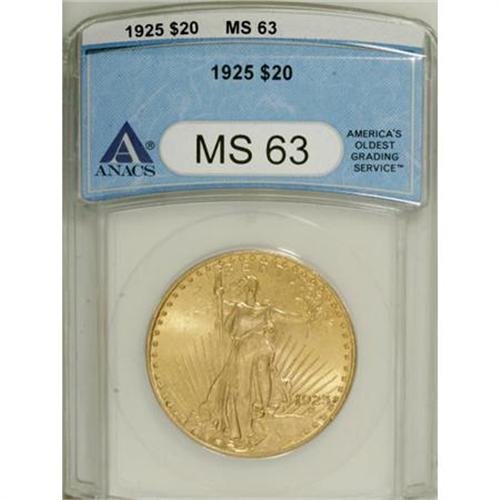 <B>1925 $20 MS63 ANACS.</B></I> NGC Census: (13178/15929). PCGS Population (10594/14098). Mintage: 2,831,750. Numismedia Wsl. Price for NGC/PCGS coin in MS63: $785. (#9180)<BR><BR><B>Coin Engraver:</B> Augustus Saint-Gaudens<BR><BR><b>Shipping:</b> Coins & Currency (<a target="_blank" href="http://www.heritageauctions.com/common/shipping.php">view shipping information</a>)