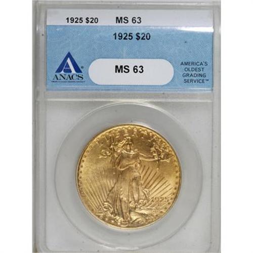 <B>1925 $20 MS63 ANACS.</B></I> NGC Census: (13287/15970). PCGS Population (10694/14494). Mintage: 2,831,750. Numismedia Wsl. Price for NGC/PCGS coin in MS63: $785. (#9180)<BR><BR><B>Coin Engraver:</B> Augustus Saint-Gaudens<BR><BR><b>Shipping:</b> Coins & Currency (<a target="_blank" href="http://www.heritageauctions.com/common/shipping.php">view shipping information</a>)