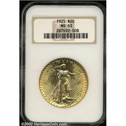 <TABLE cellSpacing=0 cellPadding=0 width="100%" bgColor=#000000 border=0><TBODY><TR><TD width="100%"><TABLE cellSpacing=1 cellPadding=3 width="100%" border=0><TBODY><TR><TD width="100%" bgColor=#79735c><FONT face=arial color=#ffffff size=3><B>Description</B> </FONT></TD></TR><TR><TD width="100%" bgColor=#ffffff><FONT face=arial size=2><B>1925 $20 MS63 NGC.</B></I> Thick mint frost causes each side of this boldly struck piece to sparkle beneath a light. The bright lemon-yellow surfaces show a small number of scattered bagmarks on each side. </FONT></TD></TR></TBODY></TABLE></TD></TR></TBODY></TABLE><BR><A name=PricesRealized></A><TABLE cellSpacing=0 cellPadding=0 width="100%" bgColor=#000000 border=0><TBODY><TR><TD width="100%"><TABLE cellSpacing=1 cellPadding=3 width="100%" border=0><TBODY><TR><TD width="100%" bgColor=#79735c><A name=PR><FONT face=arial color=#ffffff size=3><B>Previous Prices from Heritage Auctions</B> </FONT></A></TD></TR><TR><TD bgColor=#f6f6ed><TABLE cellSpacing=0 cellPadding=0 width="100%" border=1><TBODY><TR><TD align=middle width="33%"><B>Date</B></TD><TD align=middle width="33%"><B>Service</B></TD><TD align=middle width="33%"><B>Price</B></TD></TR><TR bgColor=whitesmoke><TD width="33%"><B>10/08/1994</B></TD><TD width="33%">PCGS</TD><TD width="33%">$528.00</TD></TR><TR bgColor=whitesmoke><TD width="33%"><B>05/02/1997</B></TD><TD width="33%">PCGS</TD><TD width="33%">$495.00</TD></TR><TR bgColor=whitesmoke><TD width="33%"><B>02/05/1994</B></TD><TD width="33%">PCGS</TD><TD width="33%">$550.00</TD></TR><TR bgColor=whitesmoke><TD width="33%"><B>01/11/2003</B></TD><TD width="33%">NGC</TD><TD width="33%">$448.50</TD></TR><TR bgColor=whitesmoke><TD width="33%"><B>09/28/2002</B></TD><TD width="33%">NGC</TD><TD width="33%">$431.25</TD></TR><TR bgColor=whitesmoke><TD width="33%"><B>06/04/1999</B></TD><TD width="33%">NGC</TD><TD width="33%">$534.75</TD></TR><TR bgColor=whitesmoke><TD width="33%"><B>01/06/1993</B></TD><TD width="33%">NGC</TD><TD width="33%">$577.50</TD></TR><TR bgColor=whitesmoke><TD width="33%"><B>02/06/1995</B></TD><TD width="33%">NGC</TD><TD width="33%">$495.00</TD></TR><TR bgColor=whitesmoke><TD width="33%"><B>06/04/1995</B></TD><TD width="33%">NGC</TD><TD width="33%">$627.00</TD></TR><TR bgColor=whitesmoke><TD width="33%"><B>07/29/2002</B></TD><TD width="33%">ANACS</TD><TD width="33%">$402.50</TD></TR><TR bgColor=whitesmoke><TD width="33%"><B>06/10/2002</B></TD><TD width="33%">PCGS</TD><TD width="33%">$414.00</TD></TR><TR bgColor=whitesmoke><TD width="33%"><B>06/08/2002</B></TD><TD width="33%">PCGS</TD><TD width="33%">$414.00</TD></TR><TR bgColor=whitesmoke><TD width="33%"><B>02/23/2002</B></TD><TD width="33%">PCGS</TD><TD width="33%">$373.75</TD></TR><TR bgColor=whitesmoke><TD width="33%"><B>02/23/2001</B></TD><TD width="33%">PCGS</TD><TD width="33%">$379.50</TD></TR><TR bgColor=whitesmoke><TD width="33%"><B>04/28/2002</B></TD><TD width="33%">ANACS</TD><TD width="33%">$368.00</TD></TR></TBODY></TABLE></TD></TR><TR><TD bgColor=#ffffff><FONT face=arial size=1 ?>PLEASE NOTE: All prices realized reflect the final hammer price PLUS the buyer's premium in auctions that charge a buyer's premium. Each item has a notation at the top of the listing indicating whether that lot included a buyer's premium. Example: A item that sells with a final hammer price of $100 and a 20% buyer's premium will display with a price realized of $120. All information listed is intended to be as accurate as possible, but errors are possible. Please use this guide carefully and inform us of any inaccuracies. </FONT></TD></TR></TBODY></TABLE></TD></TR></TBODY></TABLE><BR><TABLE cellSpacing=0 cellPadding=0 width="100%" bgColor=#000000 border=0><TBODY><TR><TD width="100%"><TABLE cellSpacing=1 cellPadding=3 width="100%" border=0><TBODY><TR><TD width="100%" bgColor=#79735c colSpan=6><FONT face=arial color=#ffffff size=3><B>Price Guide*</B> </FONT></TD></TR><TR bgColor=#f6f6ed><TD align=middle><B>Grade</B> </TD><TD align=middle><B>Coin World<BR>(Trends)</B> </TD><TD align=middle><B>Numismedia<BR>Retail</B> </TD><TD align=middle><B>Numismedia<BR>Wholesale</B> </TD><TD align=middle><B>Coin<BR>Universe</B> </TD><TD align=middle><B>Heritage<BR>Value Index</B> </TD></TR><TR bgColor=#ffffff><TD align=middle>62</TD><TD align=right>$550.00</TD><TD align=right>$495.00</TD><TD align=right>$430.00</TD><TD align=right>$535.00</TD><TD align=right>$404.50</TD></TR><TR style="FONT-WEIGHT: bold" bgColor=#cccfdd><TD align=middle>63</TD><TD align=right>$575.00</TD><TD align=right>$560.00</TD><TD align=right>$467.00</TD><TD align=right>$590.00</TD><TD align=right>$429.63</TD></TR><TR bgColor=#ffffff><TD align=middle>64</TD><TD align=right>$625.00</TD><TD align=right>$670.00</TD><TD align=right>$555.00</TD><TD align=right>$700.00</TD><TD align=right>$499.38</TD></TR><TR bgColor=#ffffff><TD colSpan=6><FONT size=1>*All information listed is intended to be as accurate as possible, but errors are possible. No item may be returned or refused based on this information which is provided as a service to our customers. You should contact each pricing source directly to determine the accuracy of this information. </FONT></TD></TR></TBODY></TABLE></TD></TR></TBODY></TABLE><BR><TABLE cellSpacing=0 cellPadding=0 width="100%" bgColor=#000000 border=0><TBODY><TR><TD width="100%"><TABLE cellSpacing=1 cellPadding=3 width="100%" border=0><TBODY><TR><TD width="100%" bgColor=#79735c><FONT face=arial color=#ffffff size=3><B>Population Guide</B> </FONT></TD></TR><TR bgColor=#ffffff><TD align=middle><!-- Begin Output of Population Grid--><TABLE cellSpacing=0 cellPadding=0 width="100%" border=0><TBODY><TR><TD vAlign=center><TABLE cellSpacing=0 width="100%" border=1 cellsadding="3"><TBODY><TR><TD vAlign=center><TABLE cellSpacing=0 cellPadding=3 width="100%" border=1><TBODY><TR><TD vAlign=center align=middle bgColor=#f0f1e8 colSpan=2 <CENTER><FONT face=Arial size=2><B>PCGS Pop </B></FONT><CENTER></CENTER></TD><TD vAlign=center align=midd