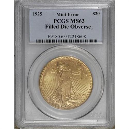 <B>1925 $20 Double Eagle--Filled Die Obverse--MS63 PCGS.</B></I> Liberty's face, chest, waist, and legs are flatly struck, as is LIBERTY. The reverse has a normal sharp strike, and both sides exhibit full luster. The obverse weakness was caused by a partly clogged obverse die. An unusual example of this popular large gold type.<BR><BR><B>Coin Engraver:</B> Augustus Saint-Gaudens<BR><BR><b>Shipping:</b> Coins & Currency (<a target="_blank" href="http://www.heritageauctions.com/common/shipping.php">view shipping information</a>)