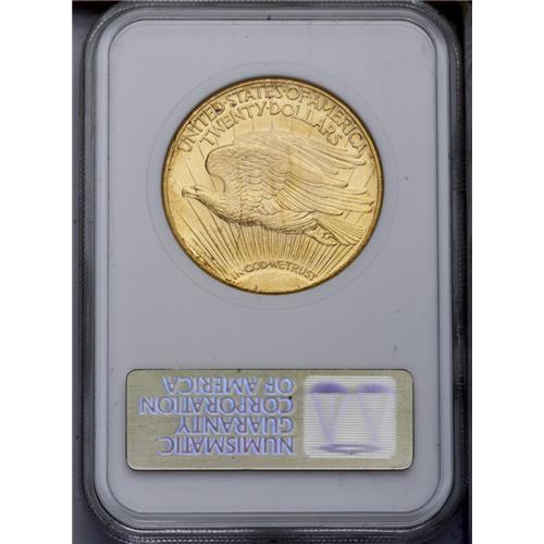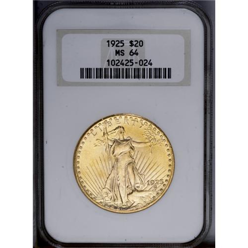 <B>1925<$20> MS64 NGC.</B></I> Pale gold, with high-end surfaces for the near-Gem designation. Close inspection reveals light amounts of russet color on the reverse that mostly clings to the edges. Housed in an older NGC holder. <BR><BR><B>Important notice:</B> Heritage usually auctions material at the rate of 200-250 lots per hour. On some occasions eBay Live bid software or the Internet may not be able to keep up with the pace of the auction. We recommend placing a realistic absentee bid now as insurance to avoid disappointment. Occasionally the auctioneer may eliminate or reject an eBay Live bid, and the auctioneer may also reopen a lot after the close of the eBay live bidding (usually because we missed an audience bid), and may reject your bid even if it shows you as the winning bidder. By bidding via eBay Live, you agree that Heritage may award the lot to another bidder at its sole discretion under the circumstances described above or any other reasonable circumstances. Since eBay bids are not shown to us until we open the lot on the floor, we treat those bids just like floor bids. In most cases the floor responds before the eBay bid is presented to us, due to Internet lag time, so for consistency we have made it a policy that floor bids are always considered first over tie eBay live bids. Also please note that all Heritage lots purchased through eBay Live carry a 20% Buyer's Premium. Please make sure you read the Terms and Conditions before you bid. This lot is being auctioned in conjunction with a live floor auction by Heritage Galleries & Auctioneers. All final auction and invoice information will be supplied by Heritage Galleries & Auctioneers, and all other information should be considered preliminary. Lot:4724 <BR><BR><B>Winning Notification and Billing:</B> After the FINAL session in this auction is complete, Heritage will send e-mail and snail mail invoices. This process normally takes several days. All final auction and invoice information will be supplied by Heritage Galleries & Auctioneers, and all other information should be considered preliminary. <BR><BR>This auction will be conducted on a live auction floor and over the Internet through eBay Live. If you choose to place an absentee bid, please take a moment to <font color='#0000ff'><u><a href='http://pages.ebay.com/liveauctions/help/before/laabsentee.html'>learn how eBay Live absentee bidding works</a></u></font><font color='#000000'>