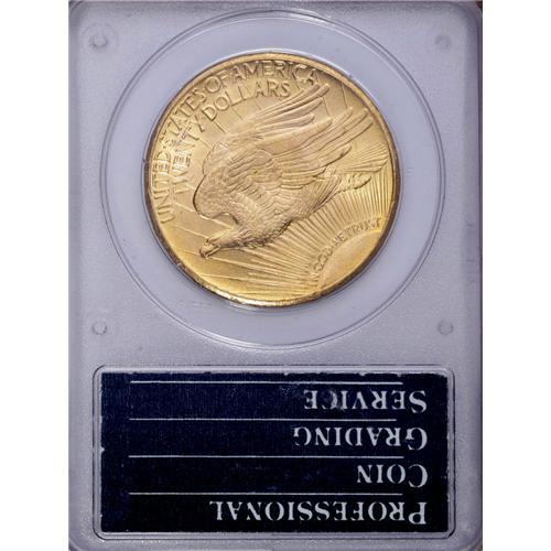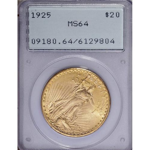 <B>1925<$20> MS64 PCGS.</B></I> A beautiful lemon-gold near-Gem with an especially clean obverse. Minor hidden marks on the eagle are all that deny a finer grade. Housed in a small-sized, first generation holder.