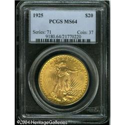 1925 $20 MS64 PCGS. A lovely and well struck repre <B>1925 $20 MS64 PCGS.</B></I> A lovely and well struck representative. The obverse is especially undisturbed, and neither side has any obtrusive handling marks. <BR><BR><B>Important notice:</B> Heritage usually auctions material at the rate of 200-250 lots per hour. On some occasions eBay Live bid software or the Internet may not be able to keep up with the pace of the auction. We recommend placing a realistic absentee bid now as insurance to avoid disappointment. Occasionally the auctioneer may eliminate or reject an eBay Live bid, and the auctioneer may also reopen a lot after the close of the eBay live bidding (usually because we missed an audience bid), and may reject your bid even if it shows you as the winning bidder. By bidding via eBay Live, you agree that Heritage may award the lot to another bidder at its sole discretion under the circumstances described above or any other reasonable circumstances. Since eBay bids are not shown to us until we open the lot on the floor, we treat those bids just like floor bids. In most cases the floor responds before the eBay bid is presented to us, due to Internet lag time, so for consistency we have made it a policy that floor bids are always considered first over tie eBay live bids. Also please note that all Heritage lots purchased through eBay Live carry a 20% Buyer's Premium. Please make sure you read the Terms and Conditions before you bid. This lot is being auctioned in conjunction with a live floor auction by Heritage Galleries & Auctioneers. All final auction and invoice information will be supplied by Heritage Galleries & Auctioneers, and all other information should be considered preliminary. Lot:7227
