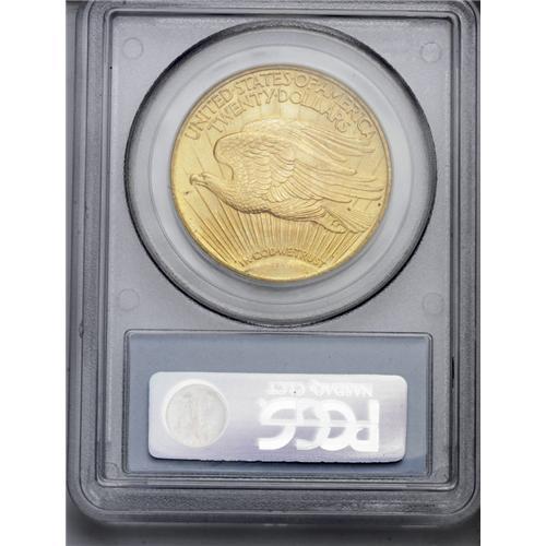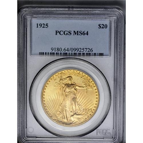 <B>1925<$20> MS64 PCGS.</B></I> Areas of greenish-gold near the peripheries compete with reddish-gold over the central devices on this pretty near-Gem specimen. This boldly struck piece is essentially free of major distractions, although a couple of small dark spots on the reverse are noted. <BR><I>From The Jackson Hole Collection.</B></I>