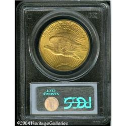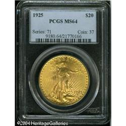1925 $20 MS64 PCGS. Lustrous and bold with no rele <B>1925 $20 MS64 PCGS.</B></I> Lustrous and bold with no relevant marks. A couple of small freckles of golden-brown color are on the central reverse, and another is on the obverse border near 12 o'clock. <BR><BR><B>Important notice:</B> Heritage usually auctions material at the rate of 200-250 lots per hour. On some occasions eBay Live bid software or the Internet may not be able to keep up with the pace of the auction. We recommend placing a realistic absentee bid now as insurance to avoid disappointment. Occasionally the auctioneer may eliminate or reject an eBay Live bid, and the auctioneer may also reopen a lot after the close of the eBay live bidding (usually because we missed an audience bid), and may reject your bid even if it shows you as the winning bidder. By bidding via eBay Live, you agree that Heritage may award the lot to another bidder at its sole discretion under the circumstances described above or any other reasonable circumstances. Since eBay bids are not shown to us until we open the lot on the floor, we treat those bids just like floor bids. In most cases the floor responds before the eBay bid is presented to us, due to Internet lag time, so for consistency we have made it a policy that floor bids are always considered first over tie eBay live bids. Also please note that all Heritage lots purchased through eBay Live carry a 20% Buyer's Premium. Please make sure you read the Terms and Conditions before you bid. This lot is being auctioned in conjunction with a live floor auction by Heritage Galleries & Auctioneers. All final auction and invoice information will be supplied by Heritage Galleries & Auctioneers, and all other information should be considered preliminary. Lot:7229