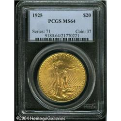 1925 $20 MS64 PCGS. Potent luster and hints of lem <B>1925 $20 MS64 PCGS.</B></I> Potent luster and hints of lemon patina invigorate this pleasing representative. No bagmarks are noticeable, and the strike is quite sharp. <BR><BR><B>Important notice:</B> Heritage usually auctions material at the rate of 200-250 lots per hour. On some occasions eBay Live bid software or the Internet may not be able to keep up with the pace of the auction. We recommend placing a realistic absentee bid now as insurance to avoid disappointment. Occasionally the auctioneer may eliminate or reject an eBay Live bid, and the auctioneer may also reopen a lot after the close of the eBay live bidding (usually because we missed an audience bid), and may reject your bid even if it shows you as the winning bidder. By bidding via eBay Live, you agree that Heritage may award the lot to another bidder at its sole discretion under the circumstances described above or any other reasonable circumstances. Since eBay bids are not shown to us until we open the lot on the floor, we treat those bids just like floor bids. In most cases the floor responds before the eBay bid is presented to us, due to Internet lag time, so for consistency we have made it a policy that floor bids are always considered first over tie eBay live bids. Also please note that all Heritage lots purchased through eBay Live carry a 20% Buyer's Premium. Please make sure you read the Terms and Conditions before you bid. This lot is being auctioned in conjunction with a live floor auction by Heritage Galleries & Auctioneers. All final auction and invoice information will be supplied by Heritage Galleries & Auctioneers, and all other information should be considered preliminary. Lot:7230