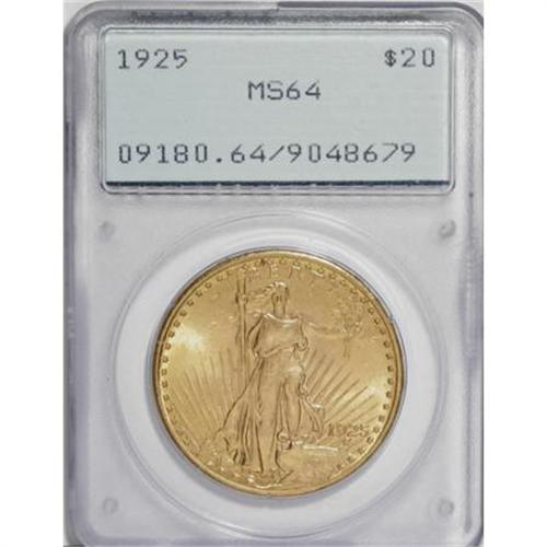 <B>1925 $20 MS64 PCGS.</B></I> PCGS Population (8720/5056). NGC Census: (12187/3630). Mintage: 2,831,750. Numismedia Wsl. Price for NGC/PCGS coin in MS64: $860. (#9180)<BR><BR><B>Coin Engraver:</B> Augustus Saint-Gaudens<BR><BR><b>Shipping:</b> Coins & Currency (<a target="_blank" href="http://www.heritageauctions.com/common/shipping.php">view shipping information</a>\)