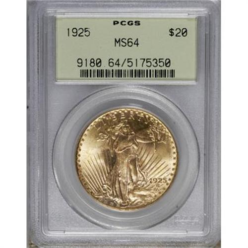 <B>1925 $20 MS64 PCGS.</B></I> . PCGS Population (9334/5591). NGC Census: (12476/3734). Mintage: 2,831,750. Numismedia Wsl. Price for NGC/PCGS coin in MS64: $1,140. (#9180)<BR><BR><B>Coin Engraver:</B> Augustus Saint-Gaudens<BR><BR><b>Shipping:</b> Coins & Currency (<a target="_blank" href="http://www.heritageauctions.com/common/shipping.php">view shipping information</a>)