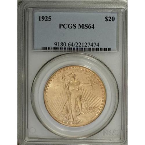 <B>1925 $20 MS64 PCGS.</B></I> PCGS Population (9401/5660). NGC Census: (12483/3736). Mintage: 2,831,750. Numismedia Wsl. Price for NGC/PCGS coin in MS64: $1,140. (#9180)<BR><BR><B>Coin Engraver:</B> Augustus Saint-Gaudens<BR><BR><b>Shipping:</b> Coins & Currency (<a target="_blank" href="http://www.heritageauctions.com/common/shipping.php">view shipping information</a>)