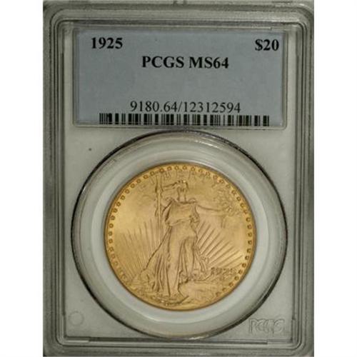 <B>1925 $20 MS64 PCGS.</B></I> PCGS Population (9609/5737). NGC Census: (12540/3779). Mintage: 2,831,750. Numismedia Wsl. Price for NGC/PCGS coin in MS64: $1,210. (#9180)<BR><BR><B>Coin Engraver:</B> Augustus Saint-Gaudens<BR><BR><b>Shipping:</b> Coins & Currency (<a target="_blank" href="http://www.heritageauctions.com/common/shipping.php">view shipping information</a>)