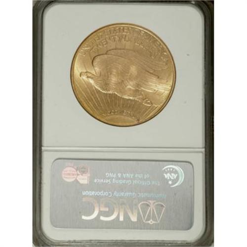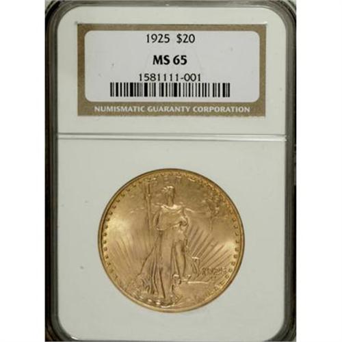 <B>1925 $20 MS65 NGC.</B></I> FS-801. The eagle's feathers are nicely die doubled. This variety may become desirable in the future. This straw-gold example has clean surfaces and unencumbered cartwheel sheen.<BR><BR><B>Coin Engraver:</B> Augustus Saint-Gaudens<BR><BR><b>Shipping:</b> Coins & Currency (<a target="_blank" href="http://www.heritageauctions.com/common/shipping.php">view shipping information</a>)