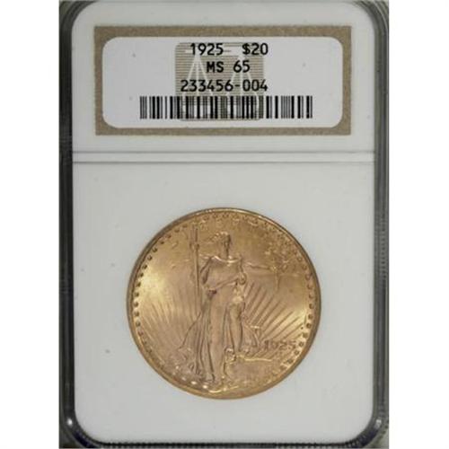 <B>1925 $20 MS65 NGC.</B></I> Peach-gold surfaces are laced with whispers of light green, and exhibit pleasing luster. Some light obverse marks do not disturb.<BR><BR><B>Coin Engraver:</B> Augustus Saint-Gaudens<BR><BR><b>Shipping:</b> Coins & Currency (<a target="_blank" href="http://www.heritageauctions.com/common/shipping.php">view shipping information</a>)