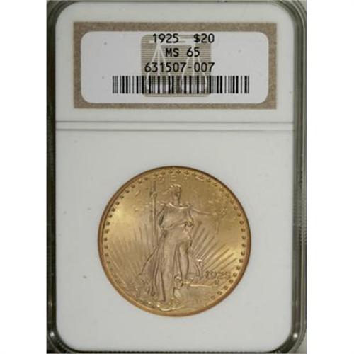 <B>1925 $20 MS65 NGC.</B></I> Sharply defined, with brassy-gold coloration imbued with hints of light green. A few minor contacts and light alloy spots do not detract.<BR><BR><B>Coin Engraver:</B> Augustus Saint-Gaudens<BR><BR><b>Shipping:</b> Coins & Currency (<a target="_blank" href="http://www.heritageauctions.com/common/shipping.php">view shipping information</a>)